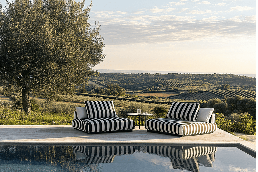A modern take on the garden stripe, which continues to forge its way with its new vintage-inspired colors, Agora® Lines evokes the serene charm of beach days in the Mediterranean and the warmth of intimate memories. Ideal for adding retro elegance to any outdoor space.